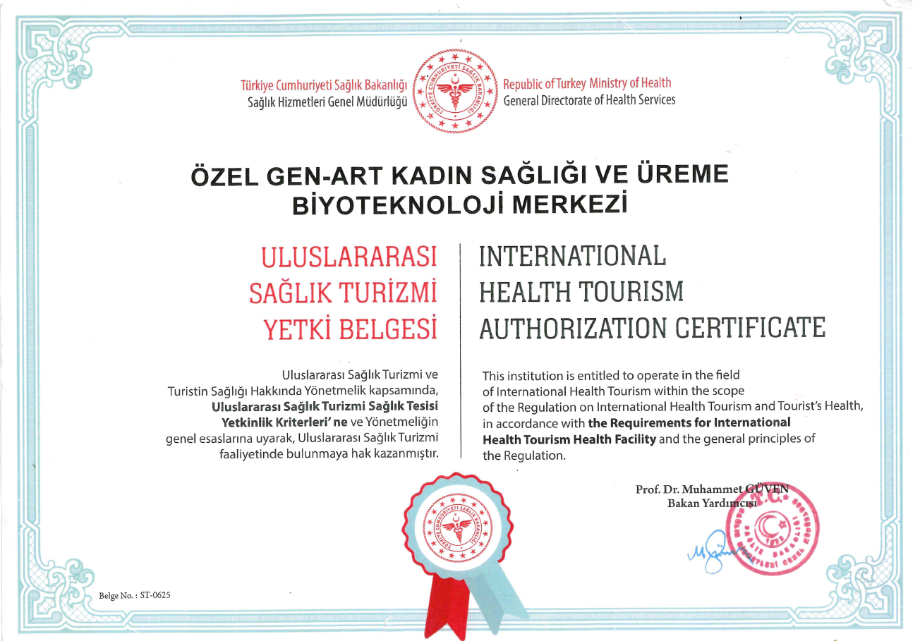 Genart Tüp Bebek Merkezi, uluslararası standartlarda sunduğu kaliteli sağlık hizmetleri ile sağlık turizmi alanında öncü bir konumda yer almaktadır. Merkezimiz, sağlık turizmi yetki belgesine sahiptir. Bu belge, hastalarımıza sunduğumuz hizmetlerin uluslararası düzeyde kabul gördüğünü ve yüksek kalitede olduğunu belgelemektedir.